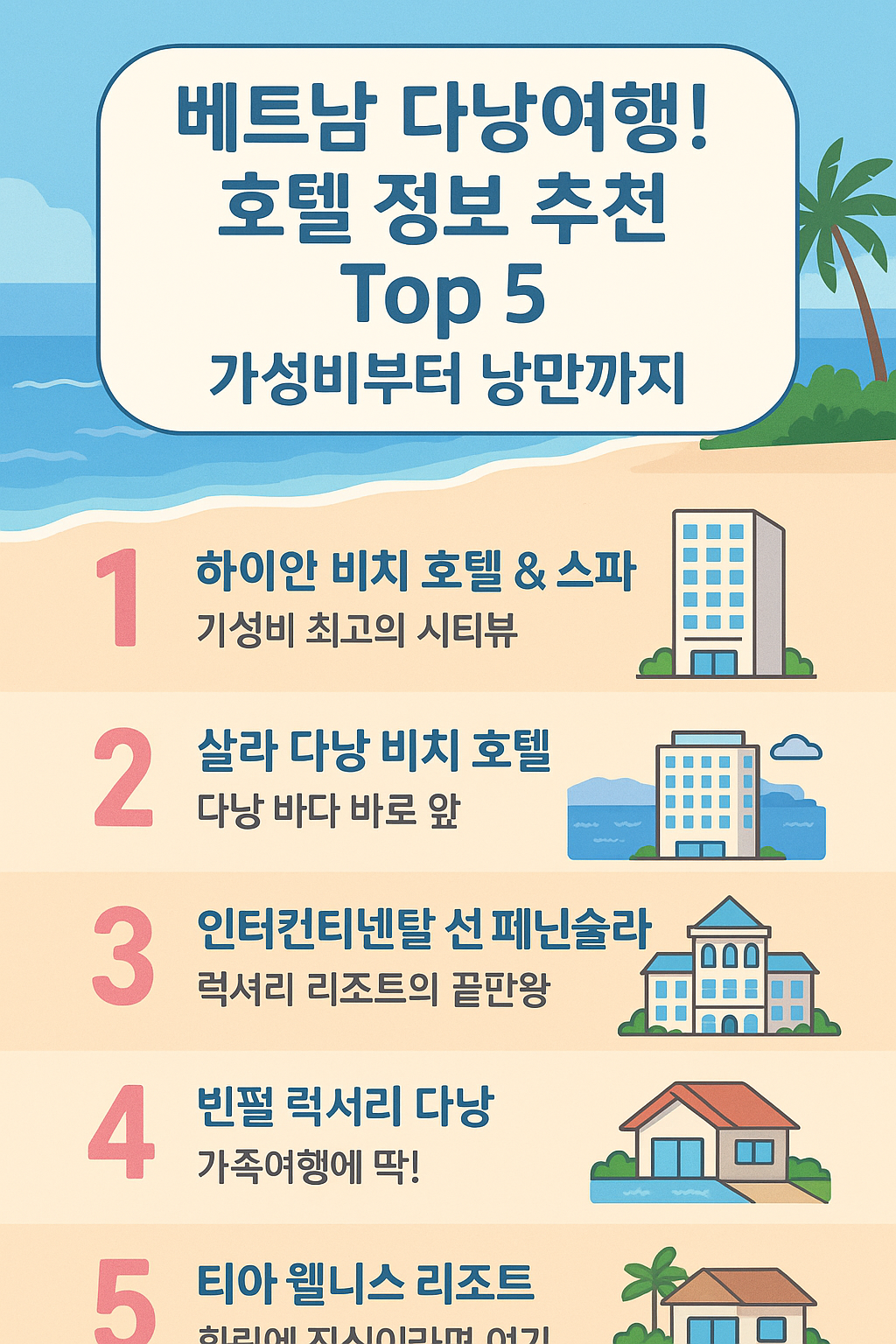 가성비 끝판왕 호텔부터 로맨틱한 풀빌라까지, 다낭 인기 숙소 Top 5를 소개합니다.