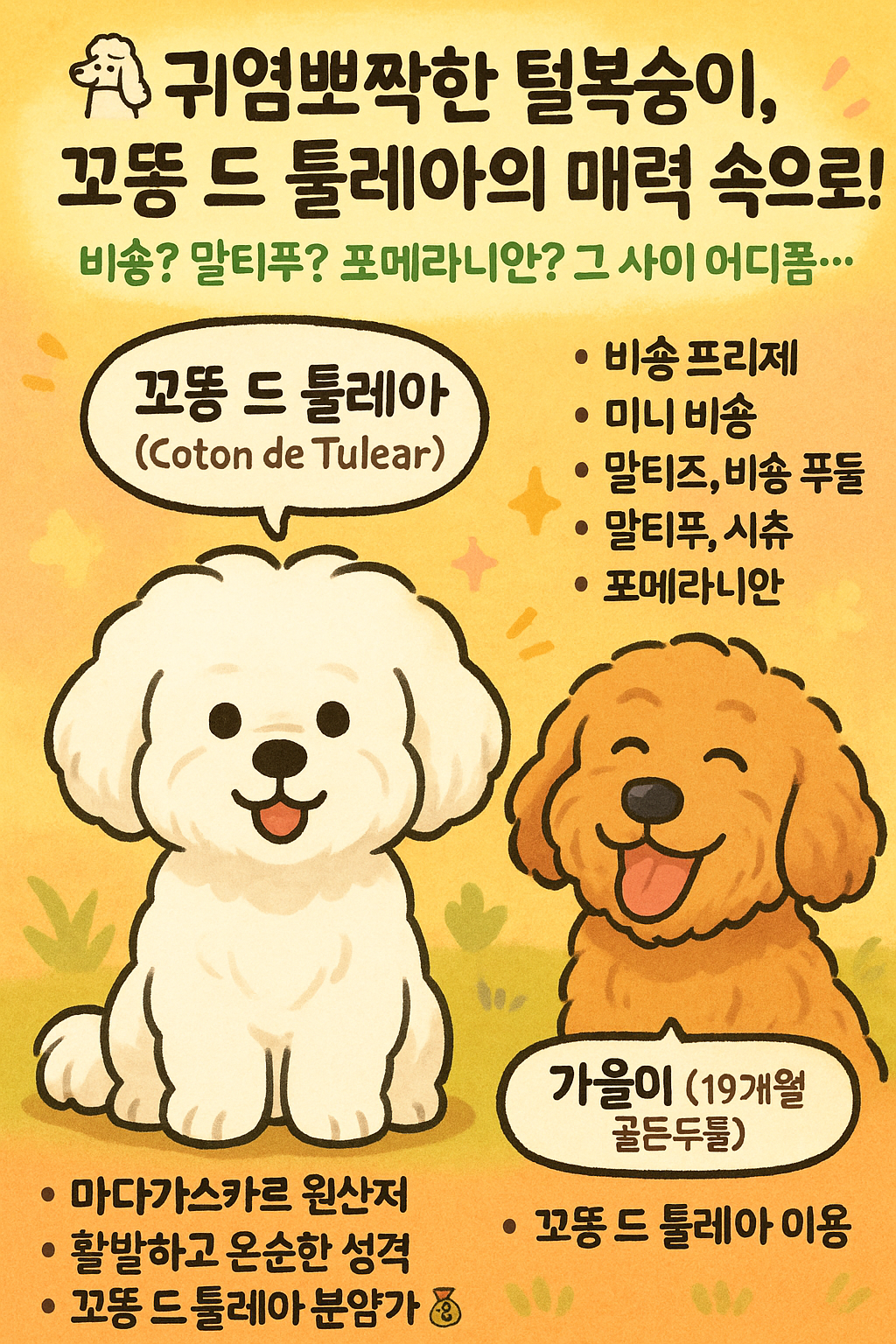 이번 글에서는 꼬똥 드 툴레아의 특징, 성격, 미용, 가격, 분양 팁까지 전부 알려드릴게요!
