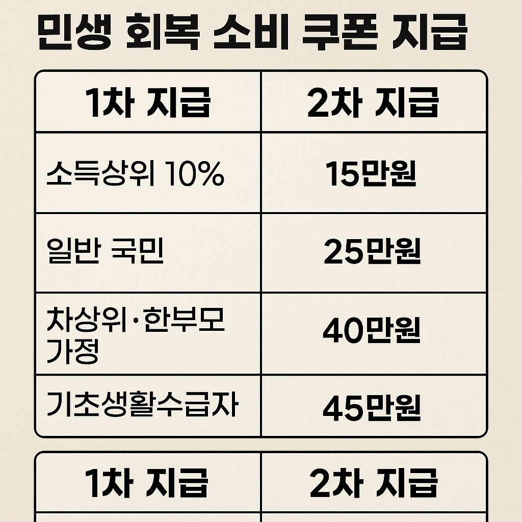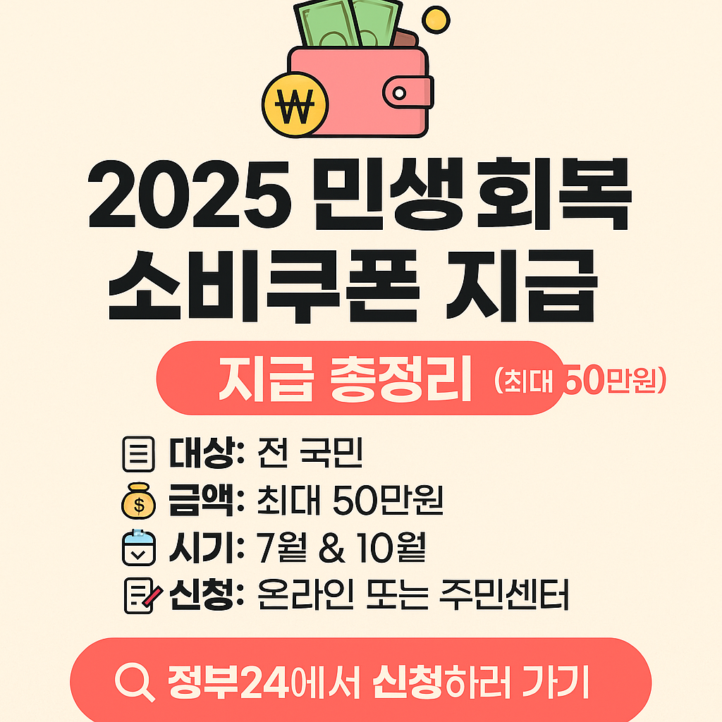 정부가 침체된 소비 활성화를 위해 2025 민생회복 소비쿠폰을 전 국민 대상으로 지급합니다. 특히 소득 하위 계층, 차상위, 기초생활수급자에게는 최대 50만원까지 혜택이 제공됩니다. 지급 대상, 금액, 신청 시기와 방법까지 자세히 정리해드립니다.