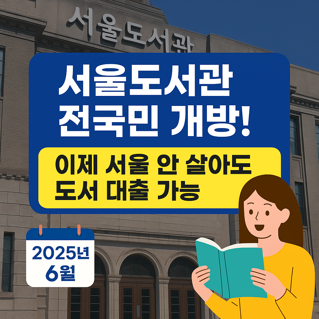 2025년 6월부터 서울도서관이 전 국민에게 완전 개방되었습니다! 서울시에 거주하지 않아도 누구나 도서 대출 및 전자책 서비스를 무료로 이용할 수 있어요.