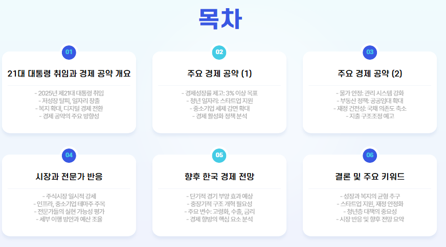 2025년 대한민국 제21대 대통령이 새롭게 취임하면서, 국내외 경제계의 관심이 집중되고 있습니다. 새로운 정부가 내세운 경제 공약은 저성장 탈피, 일자리 창출, 청년 및 노년층 복지, 그리고 디지털 경제 전환이 핵심입니다. 본 포스팅에서는 해당 공약들을 요약 정리하고 그에 따른 시장 반응과 향후 전망까지 함께 살펴보겠습니다.