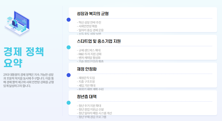 21대 대통령의 경제 정책은 성장과 복지의 균형을 추구합니다. 스타트업 지원, 재정 안정화, 청년층 대책이 핵심이며, 시장의 반응은 긍정적이지만 실현 여부에 따라 향후 평가가 달라질 수 있습니다.