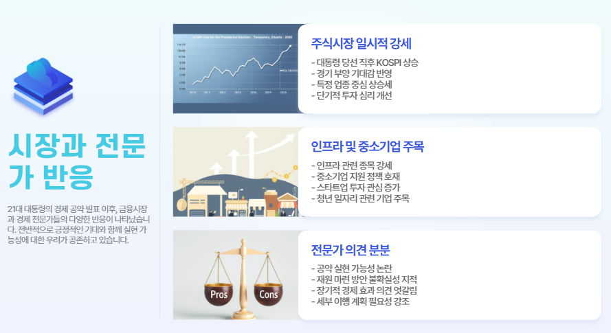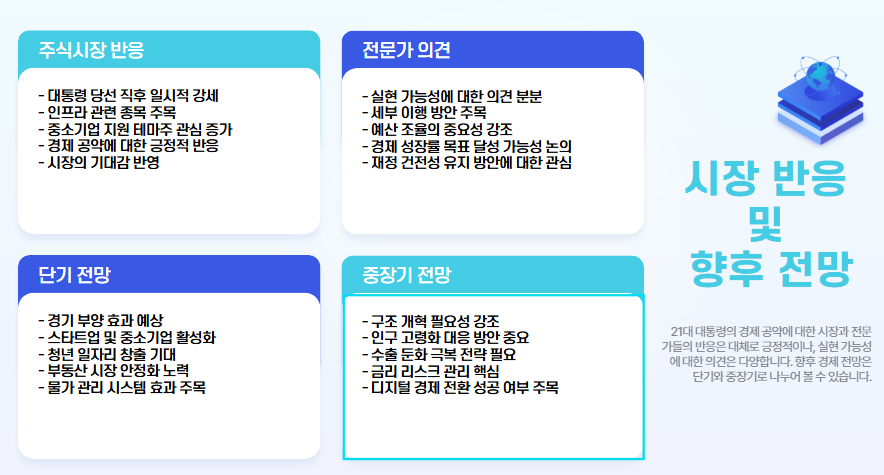 주식시장은 대통령 당선 직후 일시적으로 강세를 보였으며, 특히 인프라 관련 종목과 중소기업 지원 테마주가 주목받고 있습니다. 경제 전문가들은 전반적으로 실현 가능성을 두고 의견이 엇갈리며, 향후 세부 이행 방안과 예산 조율이 관건이라고 지적합니다.
