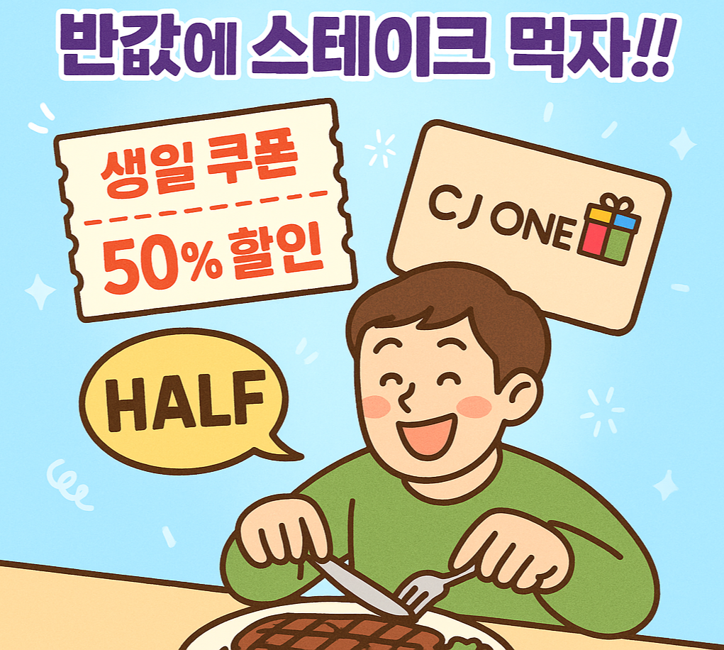 CJ ONE 회원을 위한 특별 혜택! 생일 기준 전후 15일간 사용 가능한 스테이크 50% 할인 쿠폰이 자동 발급됩니다. 디저트 뷔페 포함 메뉴도 적용 가능!