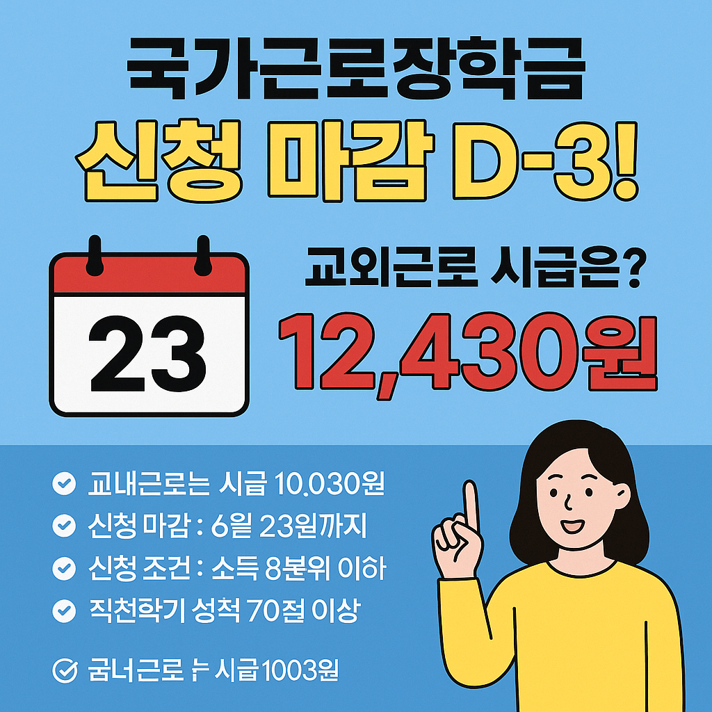 2025년 1학기 국가근로장학금 신청 마감일이 6월 23일(일)로 다가왔습니다. 특히 교외근로는 시급이 12,430원으로 매우 인기가 많기 때문에 반드시 미리 신청하세요!