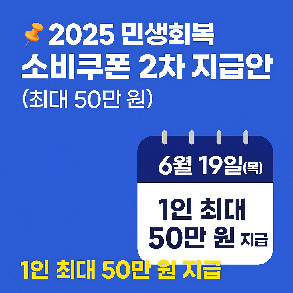 2025년 6월 19일(목) 국무회의에서 확정 발표되는 ‘민생회복 소비쿠폰 2차 지급안’! 정부는 전국민 대상으로 1인 최대 50만 원 지급을 추진하고 있습니다.